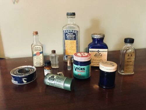 Title (ebay affiliate link): Lot 11 VTG Medicine Tins Bottles ANTIQUE Drug Store RX BATH ACME VICKS NALCO