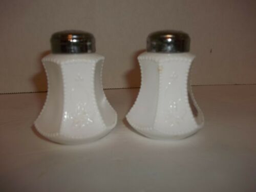 Title (ebay affiliate link): Vintage Fenton Hexagon Beaded Leaf Milk Glass Salt & Pepper Shaker Chrome Cap 3"