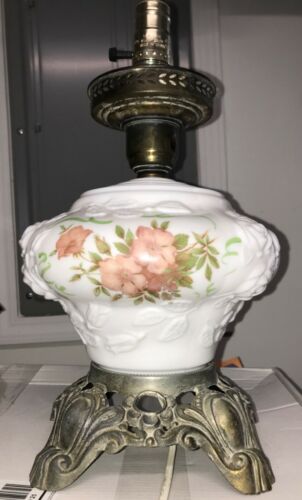 GWTW Gone With The Wind Hurricane Lamp Phoenix Wild Rose Milk Glass Embossed3way