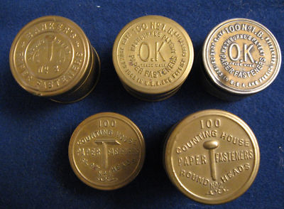 LOT OF 5 ANTIQUE BRASS WASHBURNE OK PAPER FASTENER TINS