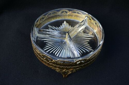 ATQ VTG Rare Divided Glass Jewelry Vanity Dish w Footed Ormolu Filigree Holder