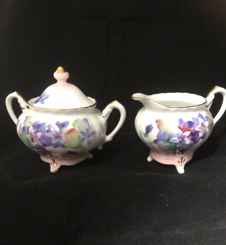 Takiro Japan Sugar And Creamer Set With Lid Hand Painted Pink Purple Gold Rim