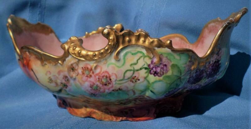 ANTIQUE GERMAN PORCELAIN HAND PAINTED CENTERPIECE BOWL COMPOTE FLORAL & BERRIES