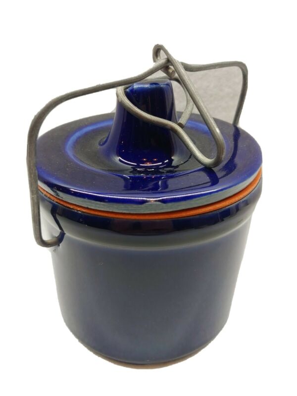 Vintage Stoneware Butter Cheese Crock W/ Wire Bail Lid Cobalt Blue