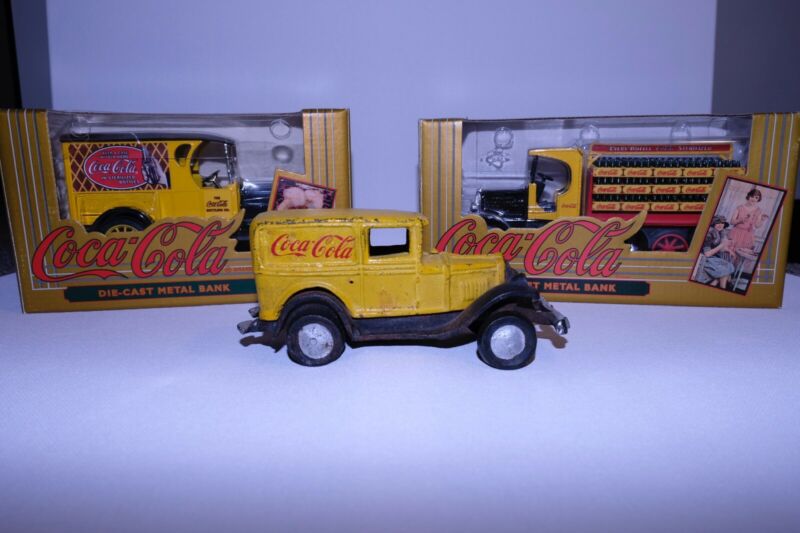 Title (ebay affiliate link): 2 Vintage 1994 Coca-Cola ERTL Die-Cast Metal Banks + Cast Iron Car