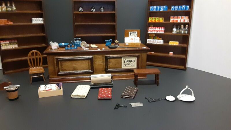 Title (ebay affiliate link): VINTAGE Huge Mix Lot Dollhouse Miniature Furniture Shelves Fabrics Dishes Food