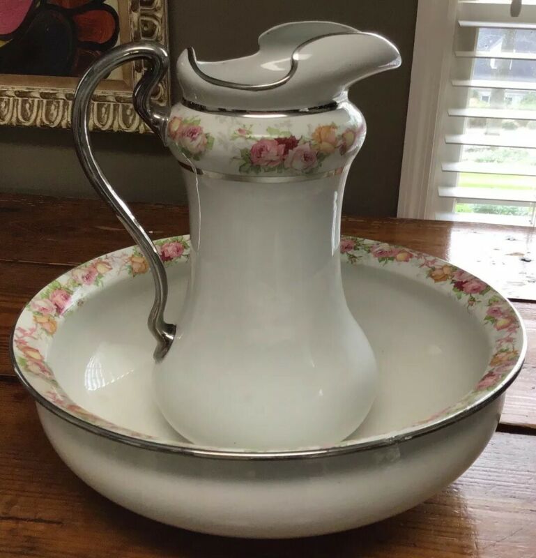 Antique Wash Basin And Pitcher Platinum Trim Roses