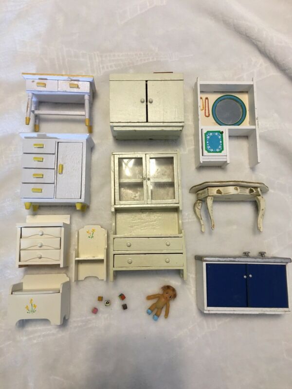 Title (ebay affiliate link): 1/12 scale Vintage dollhouse Doll Furniture Lot Child Vanity Toy Box Hutch Baby