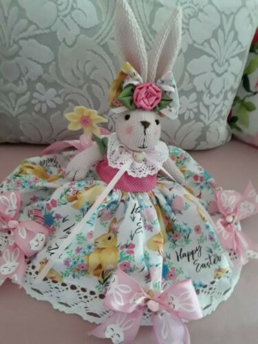 Title (ebay affiliate link): SHABBY PINK ROSES HAPPY EASTER LADY BUNNY RABBIT w/ EASTER FLOWER