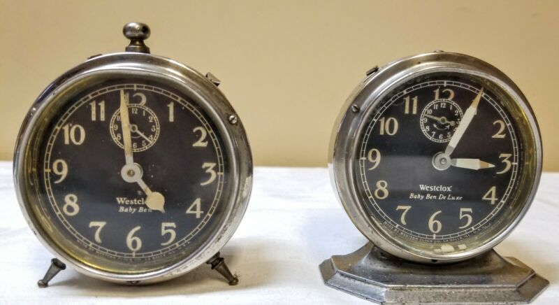 Title (ebay affiliate link): TWO ANTIQUE WESTCLOX BABY BEN BLACK DIAL MINI ALARM CLOCK VINTAGE SMALL
