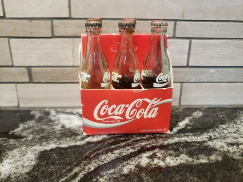 Title (ebay affiliate link): Vintage 6-Pack Carrier Mini Miniature Glass Coke Coca-Cola Bottles Metal Caps