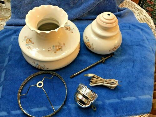 Title (ebay affiliate link): Opal Milk Glass Hurricane Table Lamp Parts W/Tan and Blue Flowers