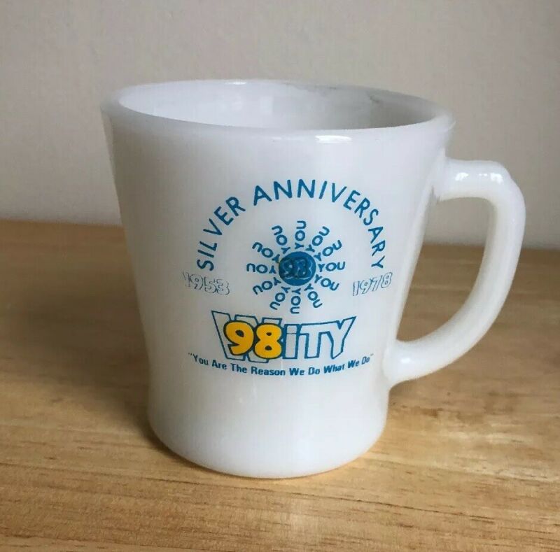98 WITY SILVER ANNIV. DANVILLE ILLINOIS ILL IL FIRE KING MILK GLASS COFFEE CUP