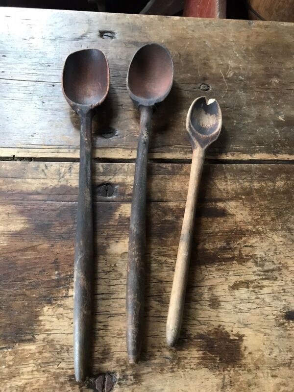 Title (ebay affiliate link): 3 Old Long Large Handmade Wooden Spoons Dark Patina Primitive AAFA Worn