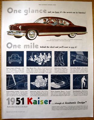 Title (ebay affiliate link): Very Nice 1951 Kaiser 4-door sedan color magazine ad