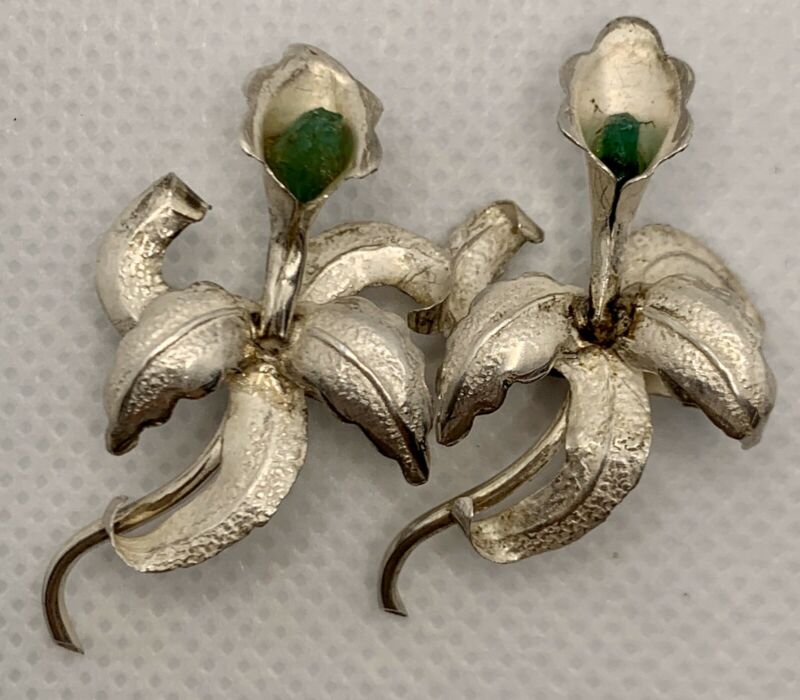 PAIR of Antique Art Deco Raw Emerald 900 Silver Orchid Flower Pin Brooch
