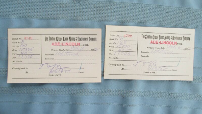Title (ebay affiliate link): 1902 Cripple Creek Colorado Stratton Abe Lincoln Mine Ore Sample Certificates