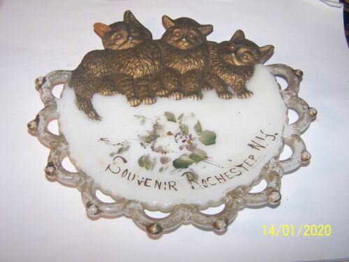 Antique MILK GLASS PLATE - 3 KITTENS - ROCHESTER, NY Souvenir