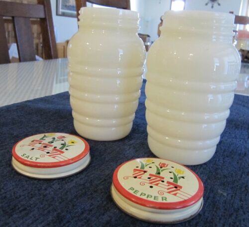 Title (ebay affiliate link): Vintage Fire King Anchor Hocking Milk Glass Beehive Banded Salt & Pepper Shakers