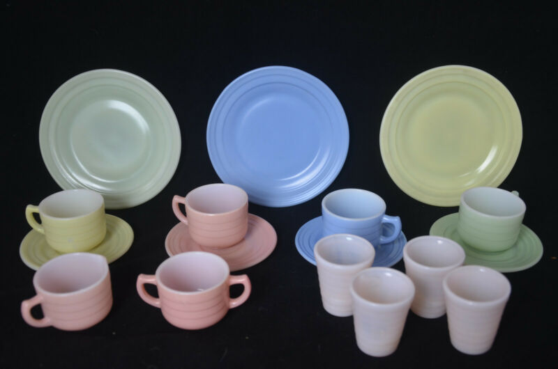 Title (ebay affiliate link): Vintage 40s HAZEL ATLAS Milk Glass Childs Tea Set Pastel Cups Saucers Plate 17pc