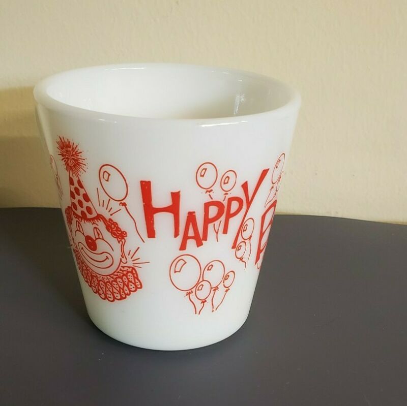 RARE PYREX HAPPY BIRTHDAY CLOWN MILK GLASS MUG