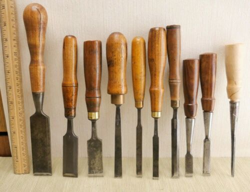 Title (ebay affiliate link): LOT OF 10 OLD TOOLS WOOD CARVING SOCKET & TANG CHISELS buck witherby butcher