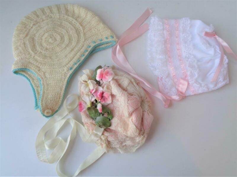 3 Antique Vintage Modern Doll Bonnets for German French Jumeau Bebe Dolls BABY