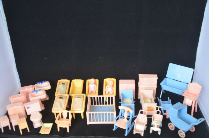 Lot Renwal NURSERY CRIBS & BABIES Vintage Dollhouse Furniture Ideal Plastic 1:16