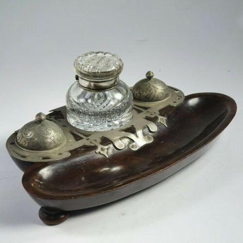 Quality Antique Wooden Inkstand - Cut Glass Inkwell