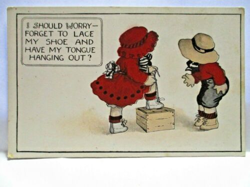 1910 POSTCARD BOY & GIRL IN HATS, I SHOULD WORRY,FORGET TO LACE MY SHOE