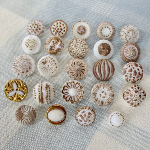 Assortment of 24 Milk Glass Buttons w Gold Luster