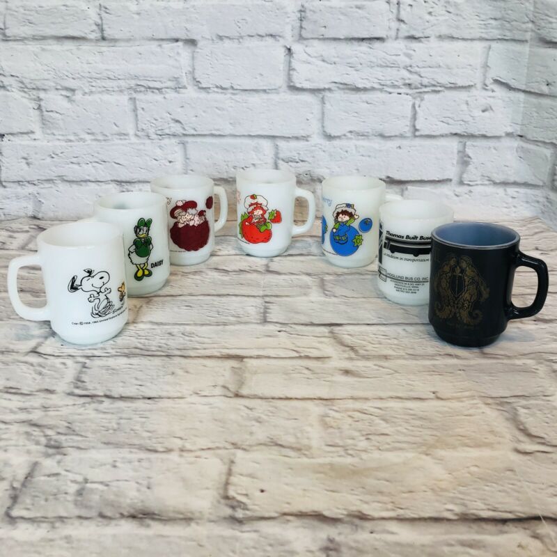 Lot of 7 Fire King Tall Milk Glass Mugs Snoopy Strawberry Shortcake Disney READ