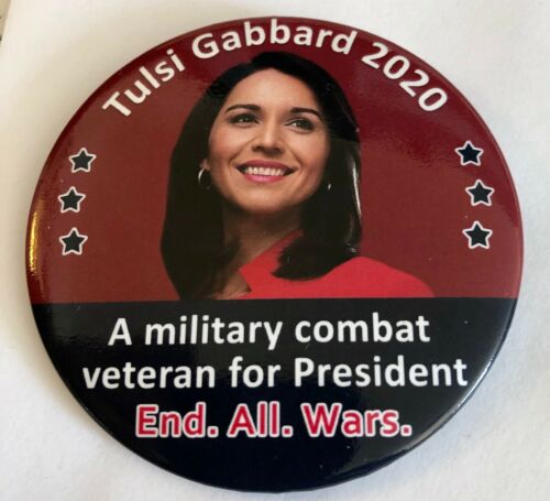 Title (ebay affiliate link): 3" Tulsi Gabbard 2020 "A Military Combat Veteran for President" Campaign Pinback