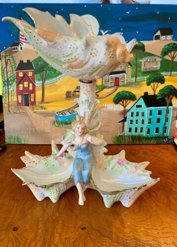 Antique German Bisque Maiden Figurine w Iridescent Shells BEAUTIFUL BIG 93/4"