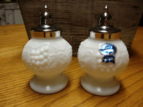 Vintage Imperial Milk Glass Grape Vine Salt Pepper Shakers Tag Sticker Heavy