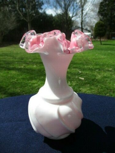 FENTON MILK GLASS VASE CASED TO PINK ROSE INTERIOR ROSE CREST SWIRL BASE 6"