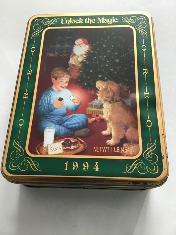 Title (ebay affiliate link): Oreo Christmas Cookie Empty Tin Box "Unlock the Magic", Boy with Dog, 1994