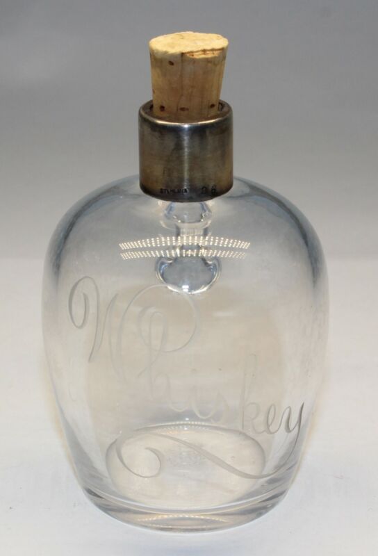 SMALL ETCHED WHISKEY JUG W/STERLING SILVER TOP