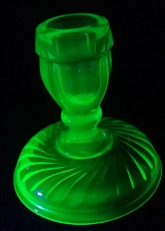 Title (ebay affiliate link): VINTAGE GREEN DEPRESSION/VASELINE/URANIUM GLASS CANDLE HOLDER