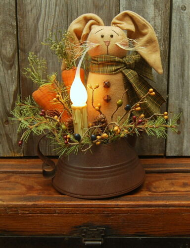 Title (ebay affiliate link): HANDMADE PRIMITIVE SPRING EASTER BUNNY RABBIT CARROTS CANDLE LAMP RUSTY KETTLE