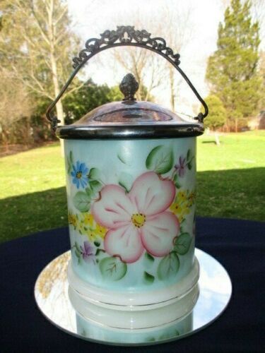 Title (ebay affiliate link): VICTORIAN ENAMEL DECORATED BLUE MILK GLASS BISCUIT JAR SILVER PLATE LID & HANDLE