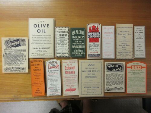 Title (ebay affiliate link): 14-OLD LARGE PHARMACY-APOTHECARY-DRUG STORE MEDICINE BOTTLE LABEL LOT=