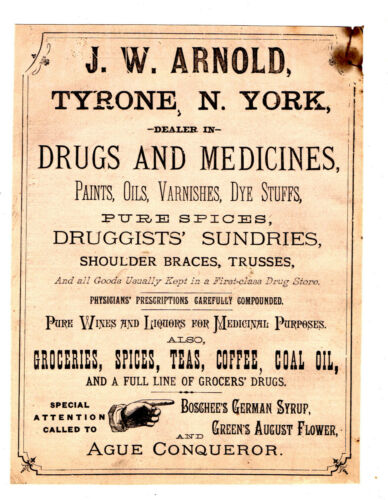 1880 J. W. ARNOLD, TYRONE, NEW YORK DRUG & MEDICINE DEALER ADVERTISING BROADSIDE