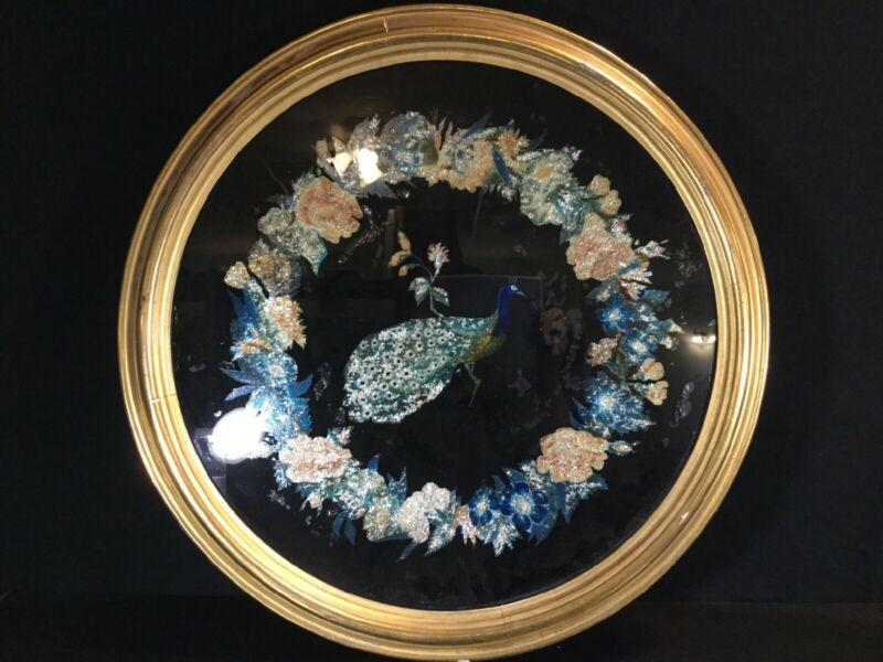 Title (ebay affiliate link): LARGE 19thc Reverse Glass Foil Tinsel Painting Antique Gilt Wood Frame Peacock