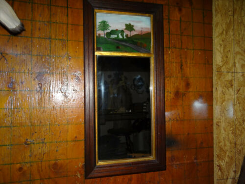 VICTORIAN ANTIQUE REVERSE PAINTED MIRROR BLACK WAINUT FRAME