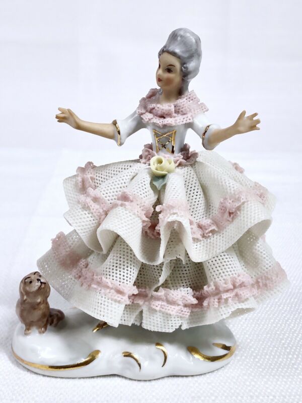 Title (ebay affiliate link): 4.25"T Sandizell Dresden Design Pink/White Lace Victorian Lady Figurine w Dog