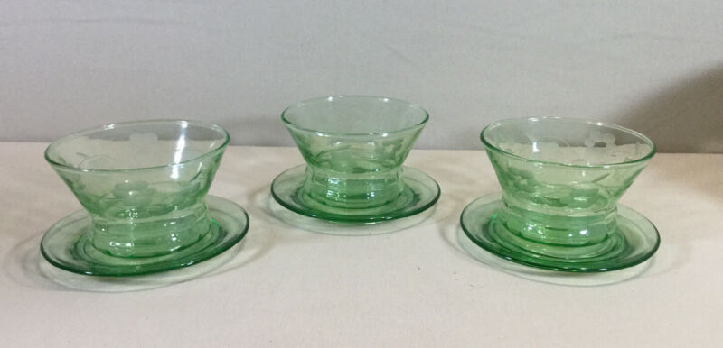 Group 3 GREEN Depression Glass Dessert Bowls Saucers Floral Pattern EUC