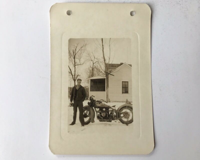 Title (ebay affiliate link): Vintage Snapshot of Handsome Man Posing with Henderson Deluxe Motorcycle