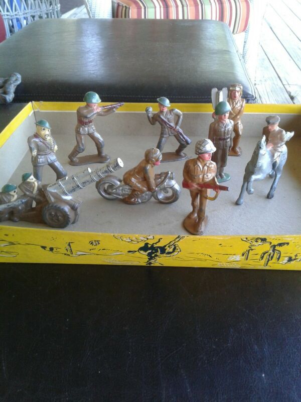 Title (ebay affiliate link): 9 VINTAGE solid cast metal mounted TOY SOLDIERS & HORSE NICE SHAPE