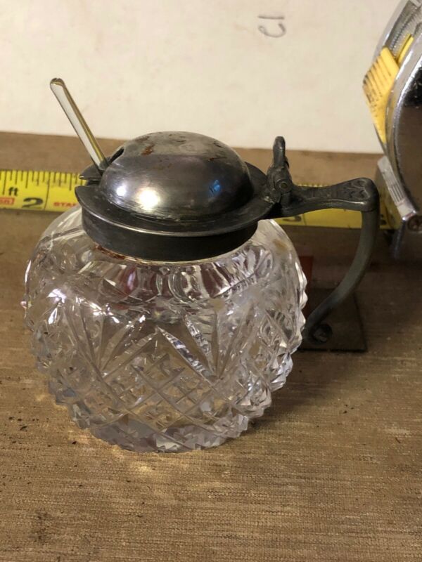 Title (ebay affiliate link): Antique Crystal Cut Glass SYRUP PITCHER Hinged Lid Silverplate With Glass Dipper